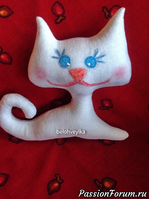 Готовым куклам я решила (в отличие от автора) добавить маленькие детали.Прошу обратить внимание на них. Собаке я повесила на шею шёлковую ленту с медалью. Коту я нарисовала блики на глазах, блик на носу, сделал румяна и завязала бант на шею. Я специально сделал фото кота до и после, чтоб вы могли сами убедится, как детали делают образ игрушки завершённым.На первом фото у кота нет блика на носу и нет банта.Сравните со следующим фото и вы со мной согласитесь.Конечно предлагаемые автором игрушки -примитивы, но мелкие детали делают игрушку ми-ми-мишной, правда?