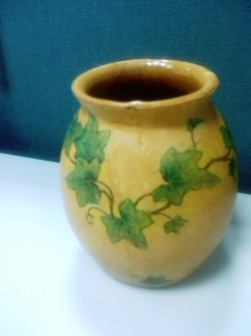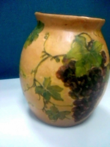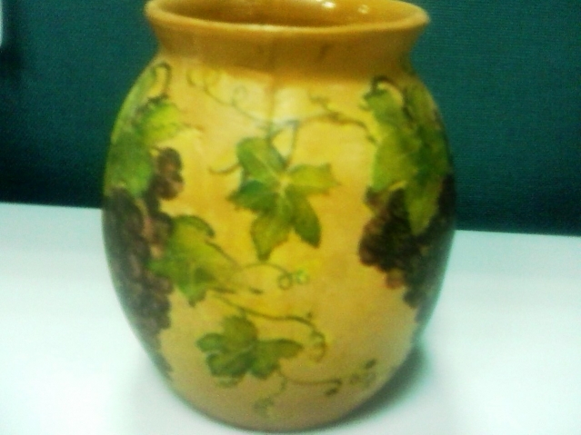 Очень понравился горшочек Галины задекупаженный плющем. У меня такого винтажного горшочка конечно не было, но приобрела по случаю на блошином рынке тару от кефира. Я никогда не делала декупаж на поверности предварительно не загрунтованной. После поста Галины я попробовала и это. Тары с плющем показалось мне мало и я добавила банку с виноградом. Совершенно разные вещи получились :)