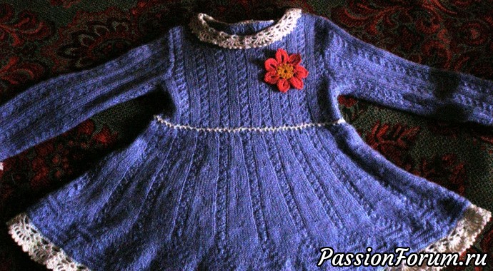 Всем здравствуйте! Я со своим очередным изделием. Для начала хочу сказать, что мне невероятно повезло, моя заказчица - сама опытная вязальщица, так что у меня первый блин не комом. Первый, потому что я раньше детские платья не вязала, все больше себе и дамам вовсе не тщедушным. В общем, идея была в том, чтобы связать теплое зимнее платье, с длинными рукавами и расклешенное. При этом вещь все-таки детская, должно быть красиво, нарядно, всякие там кружавчики-рюшечки и т.д. Стала искать подходящую модель для платья, пересмотрела свои закрома, интересного много, но подходящее к случаю не нашла и полезла в инет. Понаходила много-всяко-разно, от сногсшибательно красивого до аляповатого и неудобоваримого, но опять ни на чем не остановилась. Полезла снова к себе в норку, нашла схему кокетки от кофты и решила на ней остановиться - что получится, то получится. Ну, вроде как получилось неплохо. Верх - спинка\перед отдельными деталями, затем набрала петли по низу, схему перевернула кверх тормашками и вязала по кругу юбку сверху вниз на расширение.
