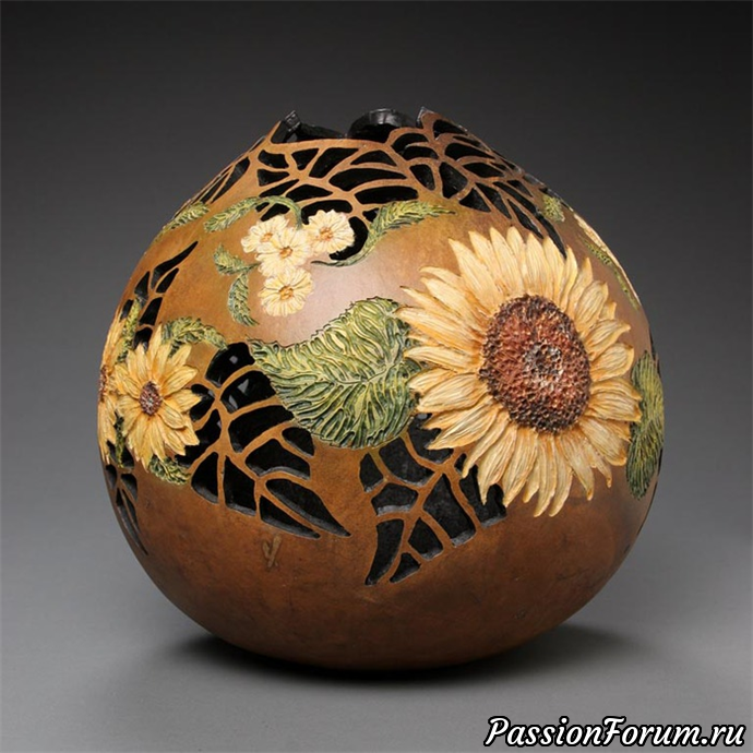 Даже не верится, что такие необычные, изящные и ажурные предметы вырезаны из обычной тыквы. Американская художница по имени Marilyn Sunderland искала себя в разных жанрах - писала пейзажи и портреты в разных техниках, но нашла себя в абсолютно удивительном искусстве — резьба по тыкве, где сейчас ей нет равных. Цветы, листья и всевозможные замысловатые орнаменты – основные мотивы работ художницы. Эти оригинальные предметы могут украсить любой дом, даже Белый дом, что и сделал Джордж Буш, приобретя одну из тыкв. Художница получает вдохновение от горных районов, наполненных красками природы. Искусство всегда было частью жизни Мэрилин. Ее предназначение – это резьба.