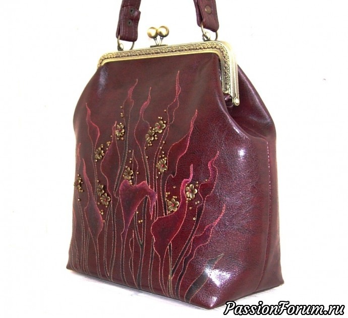 Темно- вишневый, глубокий цвет)))Эко-кожа лаковая, технология декора "витражная")))) - контуры цветов выстрочены, тонировка монохромная, благородная...легкая...Еле слышная...Настоящие вишневые сумерки.. Дополнительный декор античными металлическими цветочками и бисером. Дно укрепленное, на ножках, два кармана внутри и один на тыльной стороне на молнии. Фермуар 20 см. Ручка на кольцах,при желании еще можно удлинить кольцами. Подклад - шелк подкладочный,цветочный, простеган с синтепоном. Весь декор тщательно укреплен))) размер 26х26х10, Пока свободна)