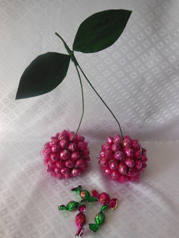 Приветствую всех кто заглянул. Хочу представить свою работу на конкурс "Сладкие радости". Помните в сказке про Чипполино были такие забавные персонажи как графини Вишни. Вот их я и решила сделать. Для композиции понадобятся следующие материалы: - 2 пенопластовых шара (у меня диаметром 5 см) - фатин малинового цвета - конфеты (у меня Вишня в шоколаде) - флористическая проволока - тейп-лента зеленого цвета - зеленая гофробумага - пищевая пленка - зубочистки - нитки - клей горячий пистолет - н...
