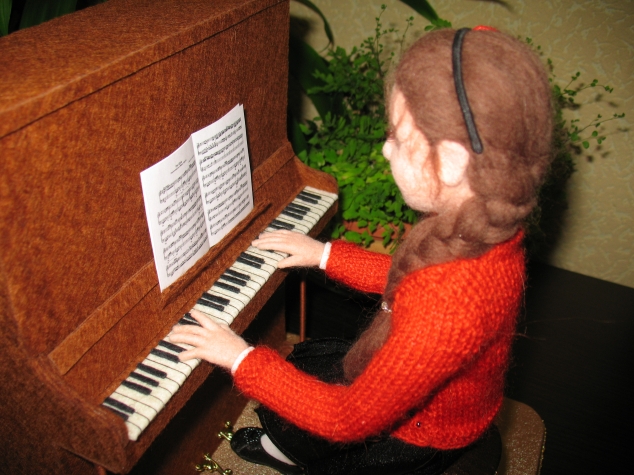 Знакомьтесь, это Лера! Лера - чудесная девочка! Она красиво поет и играет на пианино. У Леры скоро День рождения! Теперь пару слов о композиции. Кукла, как и все мои человечки, частично валяная, частично сшита. все тело и даже каждый пальчик на проволочном каркасе. Пианино сделано из картона и обклеено фетром. Фетр делала так же сама. валяла по мокрому. Стульчик сделан из крышечки от крема для лица, колпачка от фломастера и ножки кукольного столика ))))) ...
