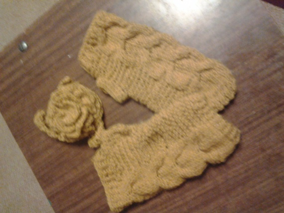 Ну вот еще вязание.Это платье сделано на иглах на малышку 10-11 см: Для куклы-подростка ростом 20 см.Парик делала тоже сама, неудачно сел на куклу, еще не обстригла как надо.:)