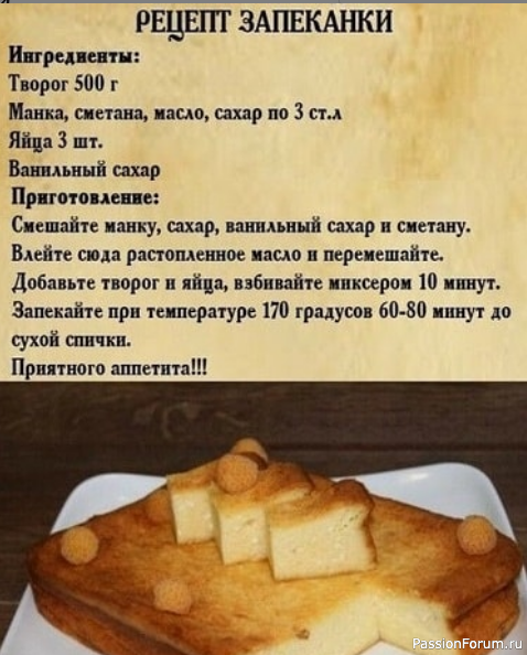 Ингредиенты на 500 гр жирного творога 9% или 18%: - 3 яйца - 5 ст. ложек сахара - чуть-чуть соли - 6,5 ст. ложек манки - 3 ст. ложки сметаны - 0,5 ч. ложки соды - ванилин Приготовление: 1. Все хорошо перемешиваем и в конце добавляем 2-3 средних банана (они должны быть немного недозрелыми с плотной светлой кожурой, иначе в духовке они превратятся в запеканке в кашу, а нам нужны кубики бананов) нарезаем кубиком 1*1 см и в запеканку, перемешиваем ложкой. 2. Форму смазываем сливочным маслом. 3. Ставим фор...