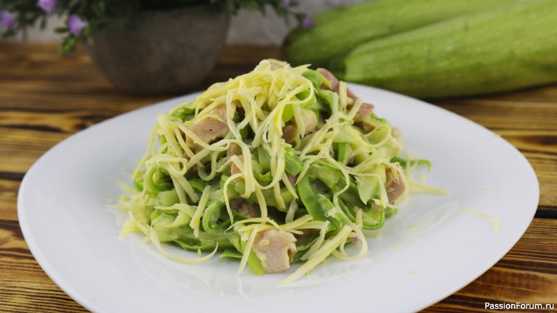 Пока сезон кабачков, самое время попробовать спагетти из кабачков с копченой курицей - это идеальное блюдо на ужин! Готовится быстро, просто, а получается очень вкусно! Ингредиенты: Кабачки молоденькие – 500 г Копченое мясо курицы – 200 г Сливочный плавленый сыр – 40 г Твердый сыр – 20 г Масло подсолнечное – 2 ст.л. Чеснок – 1 зуб. Соль – 0.5 ч.л. Перец – по вкусу Полный рецепт