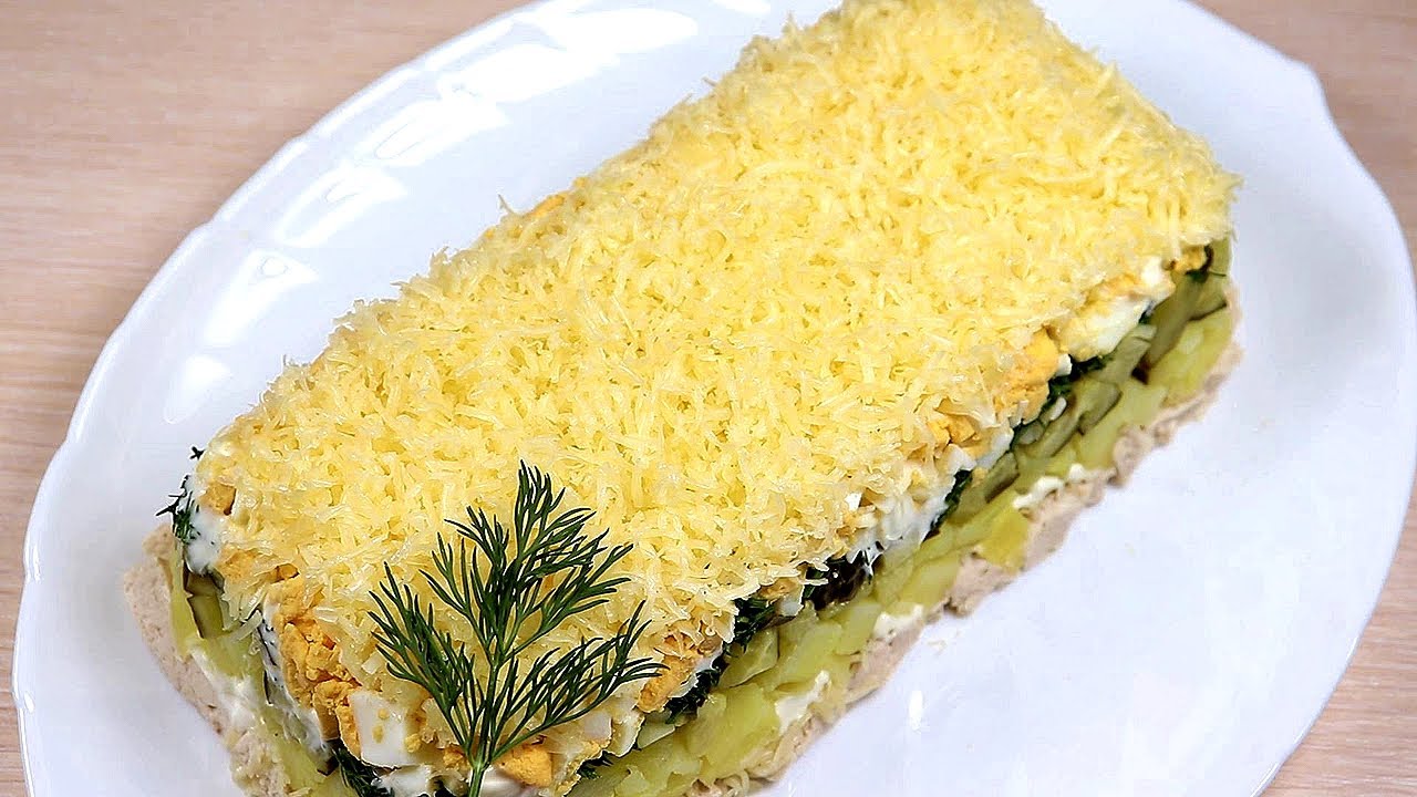 Делюсь простым рецептом. Слоёный салат с печенью трески