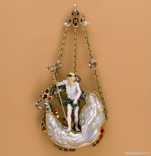 Мода на жемчуг неправильной формы появился в эпоху барокко в XVII-XVIII веках. Уникальные жемчужины причудливой формы будили воображение, заставляя ювелиров создавать необыкновенные украшения в виде сюжетных композиций с мифическими животными, человеческими фигурами, необычайными созданиями растительного и животного царства. В таких творениях ювелирного искусства жемчужины заключались в золотую оправу и дополнялись другими драгоценными камнями (рубинами, изумрудами) и эмалью. Кулон...