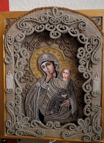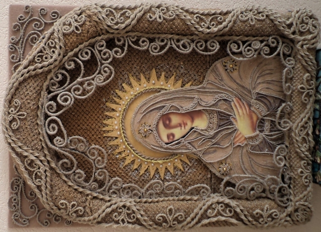 Икона выполнена сочетанием техник макраме, гильоширование, аппликация и не знаю как назвать эту технику, принцип такой же как при ниточной филиграни- клеится нитка к нитке. В этой технике выполнены: плащ и платье. Отделка одежды. оклада и рамки -макраме