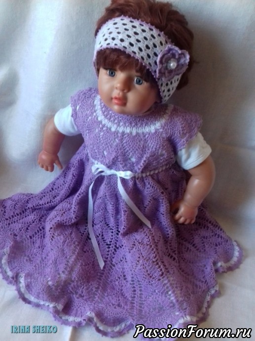 Здравствуйте, уважаемые форумчанки ! Хочу представить Вам новое платье "Лаванда". Платье связано для девочки 1-2 года. В работе использовала нитки в бобинах (65%-лен, 35%-ПЭ) в 100 граммах 1600 метров в два сложения, крючок 1 мм, расход 180 грамм. Кокетку вязала по прилагаемой схеме, для юбки использовала узор листиков с этой же схемы.