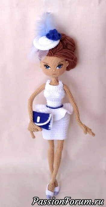 Кукла связана крючком из акриловой пряжи, одежда снимается. Мягконабивная, глаза вышиты, волосы крепко пришиты. Подойдет для украшения интерьера, для игр и как подарок. Возможна нежная мокрая чистка, сушить без отжима и скручивания.