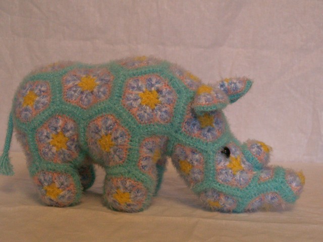 Девочки, всем доброе утро! Я хочу показать еще одного "африкана". Он житель Африки и связан "африканским цветком". У меня он получился мягким и пушистым. Знакомьтесь - Солнечный носорог. Есть несколько мастеров, кто придумывает, как вязать такие игрушки. Этот носорог связан по МК Хайди Беарс.
