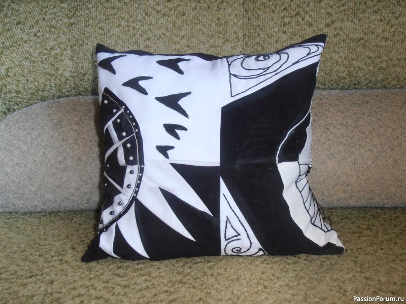 Дизайн мой. Поясню, если кому непонятно: Солнце слева, постепенно затемняется, всё еще вспыхивая маленькими искорками (это бусины), Луна справа. Материалы: остатки белого и черного бархата, бусины, вышивка чёрным мулине.