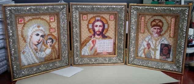 Попались мне как-то в магазине маленькие схемки икон, не удержалась и купила. Вышивала не зная для кого, кому достанутся. Хотя нет один триптих вышивала для родственников вот этот схемки маленькие можно судить по количеству необходимого бисера вот фото по отделньсти но на работе была благотворительная ярмарка, я боялась что будет мало лотов представлена и предоставила эти работы для участия А вот второй набор который мн...