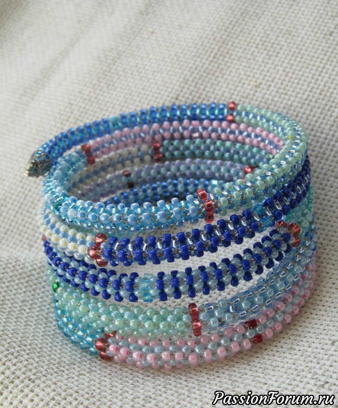 Здравствуйте! В ютубе увидела МК интересного браслета :" Как сделать браслет из двухслойной манжеты с наполнителем из Назо". В работе использовала остатки бисера и замочек который никуда не подходил из-за большого размера. Плела мононитью. Результат понравился.