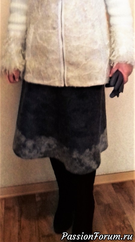 Три года валяю но получались только шапочки). Не могу я неделями одну вещь делать, мне надо все сразу в один день). Наконец, насмотревшись мк Кондрашовой и Ткаченко решилась. Раскладка: вискоза облачка, Сливер чёрный новозеландский ёлочкой, опять вискоза облачка. Валяние только в плоскости и главное это ВТО ( влажно тепловая обработка), на каком то Шерстивале девчонки показывали подробно. КУ=1.4. Юбочка как из материала: тонкая и струящаяся. Общий вес 300 г. Длина 1 м на 52 р хороший размер). Д...