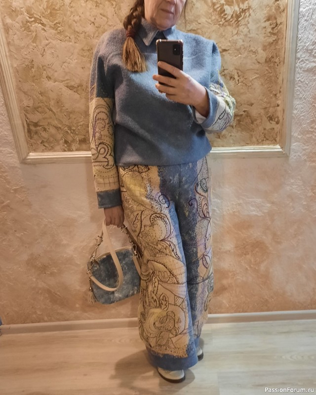 Особенно нужно обратить внимание на скорость...))) Мой костюм- ансамбль воплощался с прошлого лета. Обычная деревенская шерсть,вискоза,мулине вышивка,швейная машинка мне в помощь. Сумочку показывала недавно.Повернула другой стороной - так гармоничней.Фото с бухты- барахты. В эту весну мне будет тепло и удобно.