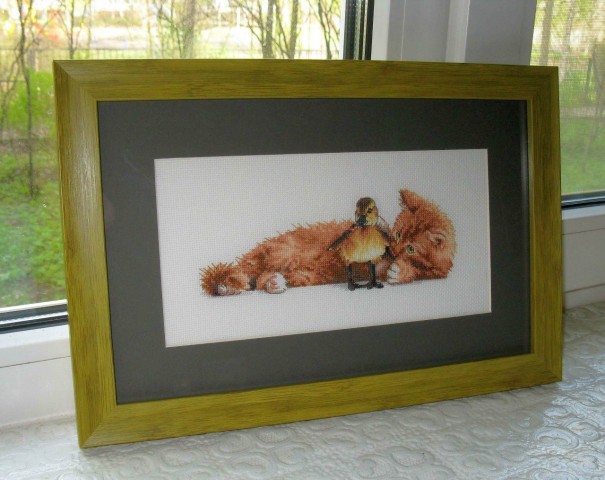 Это мой любимый Магический Котик на трубе. Нитки подберала по каталогу ДМС. Я вообще люблю вышивать только большие работы. Раньше очень много вышила на заказ. Фотографий к сожалению не осталось.