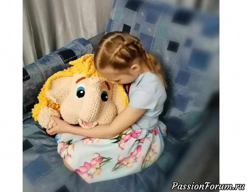 Вот такая необычная подушечка связалась для внучки. Мамонтенок Тим.Связан руками без спиц и крючка из ниток Пуффи файн.Ушло почти 10 мотков.