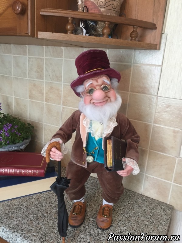 Вот такой он родился 15.08.2017 года !!!!! Ростиком выдался большим -47см ( без учета шляпы). Ручки, ножки , голова , пальчики- все гнется , что позволяет куколке принимать различные положения ( сидеть , стоять в разных позах и т. д) . Сделан Оле в смешанной технике ( сухое валяние+ чулочная техника ) . Одежда -бархат, шифон,кружево. Ботинки из натуральной кожи.Аксессуары- зонт книга полностью ручная работа .