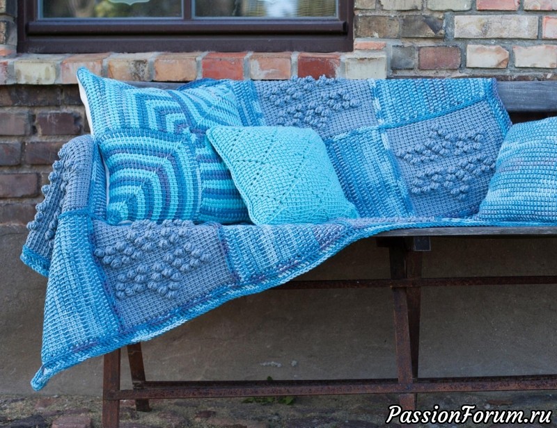 Красивый плед связан в тунисской технике и состоит из гладких и рельефных мотивов, выполненных из пряжи двух цветов. Я хочу связать не плед, а покрывало. Думаю такое покрывало будет очень красиво смотреть как на диване, так и на кровати. РАЗМЕР 155 x 93 см ВАМ ПОТРЕБУЕТСЯ Пряжа 1 (60% натуральной шерсти, 40% полиакрила; 100 м/50 г) – 800 г серовато-синей и 400 г голубой; пряжа 2 (60% натуральной шерсти, 40% полиакрила; 100 м/50 г) – 800 г бирюзово-синей секционного крашения; крючок №7 с л...