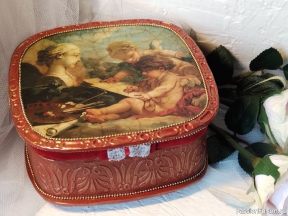 Шкатулка к авантюре на тему «Художники и художества: «Мировые шедевры»Тема «Кисти, краски и холсты-вы мое призвание» Художник Франсуа Буше Шкатулка » Амуры — Аллегория живописи" Работа сделана полностью из картона, лепной декор из массы, лазерная распечатка, подрисовка, шпаклёвка, трафарет, двух-шаговый кракелюрный лак, битумная паста, акриловые краски, металлики медь, золото, воск бронза, акриловый матовый лак, тесьма, стразовая цепочка, фурнитура. Шкатулку сделала из картона, покрыла шпаклёвкой...