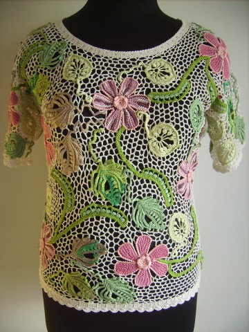 Блуза связана крючком, скорее, в стиле Ирландское кружево,потому что сетку я вязала "как хочу" и почти регулярной сеткой.Цветы-тунисское вязание,листья-и по схеме,и импровизация.Пряжа-хлопок мерсеризованный однотонный и секционного окрашивания.
