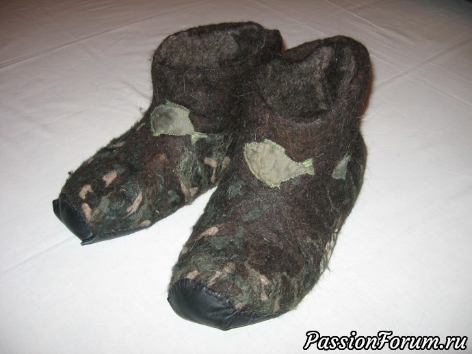 Скоро я перепробую все виды рукоделия, но что-то мне подсказывает, что валяние будет моей основной любовью. Валяю, стараюсь, результат не всегда такой, как я хочу. Думаю все, хватит, больше не буду. И через какое-то время ловлю себя на том, что снова покупаю и шерсть и все больше и больше. С нетерпением жду совместника по тапкам, а пока хочу показать своих уродцев. Первые тапки поехали зимой в Речицу к свекрови. Она их носит и зимой и летом. Там под подошвой подпяточники из поролона, для ее больных ноже...