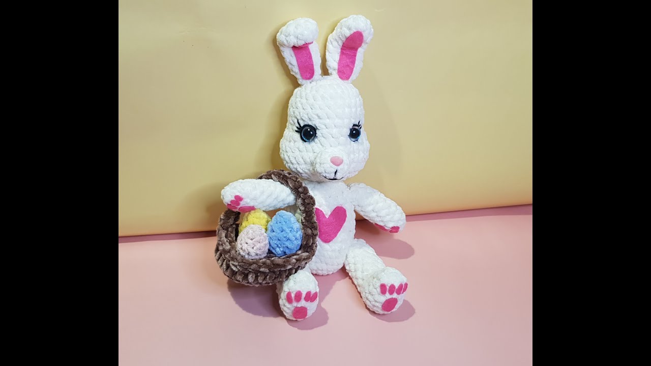 Всем Здравствуйте! В преддверии Пасхи,связала я пасхальных зайчиков крючком из плюшевой пряжи. В таком положении сидя,в высоту они получились 31 см. Ссылка на ютуб