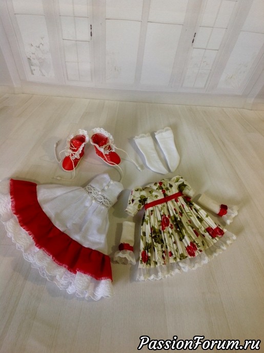 Комплект одежды для куклы. Выполнен из хлопка в красных тонах . Белое нижнее платье с двойной оборкой - красного цвета и хлопковое белое шитье, отделка кружевом, платье с кружевной рюшей с отделкой розами из атласной ленты и шебби-лентой, белые трикотажные митенки с кружевом украшены атласными розочками, белые с кружевом носочки, красные ботиночки с отделкой кружевом.