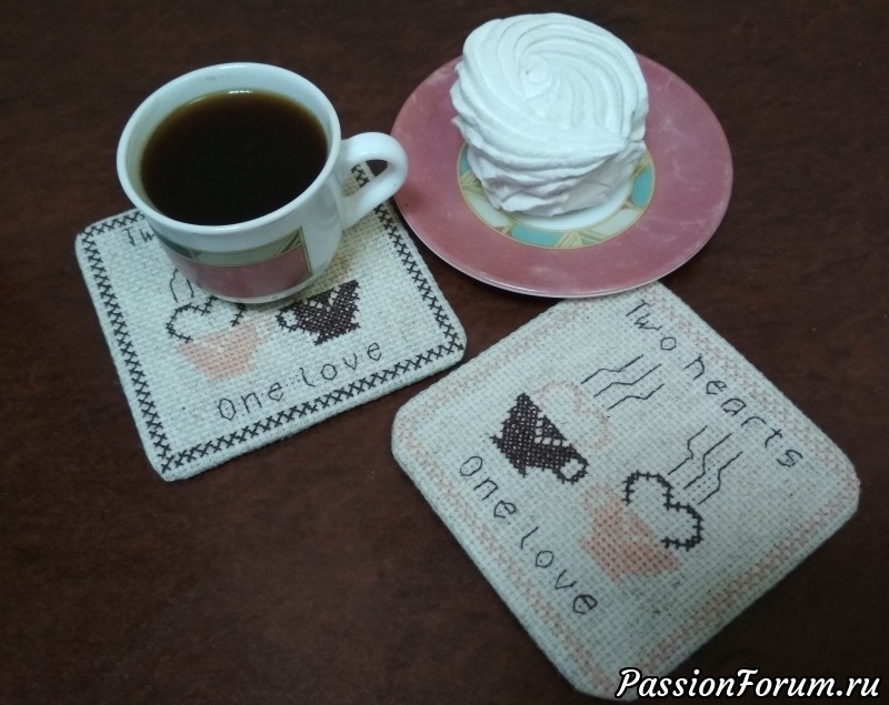 Желаю всем, для ДВУХ СЕРДЕЦ ОДНУ ЛЮБОВЬ!!! Когда увидела эту картинку в интернете, решила, что мне, непременно, нужна такая же, даже, сразу определилась, куда ее применю. Решила, что сделаю из нее «валентинки» ( подставочки для чашек) сотрудницам к празднику . В офисе - это всегда нужная вещица для "перекусов" во время кофе-тайма. Для начала мне понадобилось: пяльца, канва, иголка, нитки мулине. Схему не нашла, поэтому вышивала по картинке прямо с телефона, увеличивала изображение и счи...