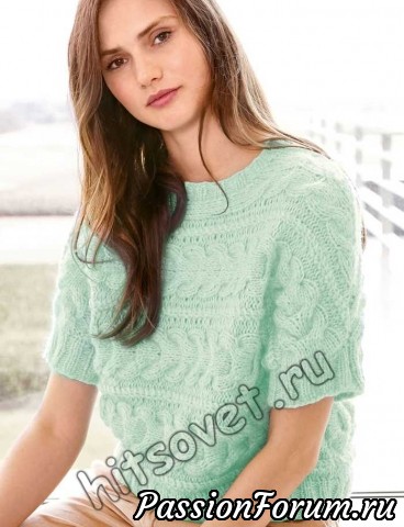 Модная модель женского джемпера с горизонтальными косами со схемой и бесплатным описанием вязания. Вам потребуется: 200 (250, 300) грамм цвета жадеита (цвет 18) пряжи Lala Berlin Softness, состоящей из 40% шерсти, 40% полиамида, 20% мохера, длиной нити 110 метров в 50 граммах от Lana Grossa; прямые спицы № 8, круговые спицы № 7 длиной 40 и 80 см. Размеры джемпера : 42-44 (46-48, 50-52). Узор для планок : попеременно 2 лицевые, 2 изнаночные петли. Узор с косами : число петель кратно 18, вязать по схе...