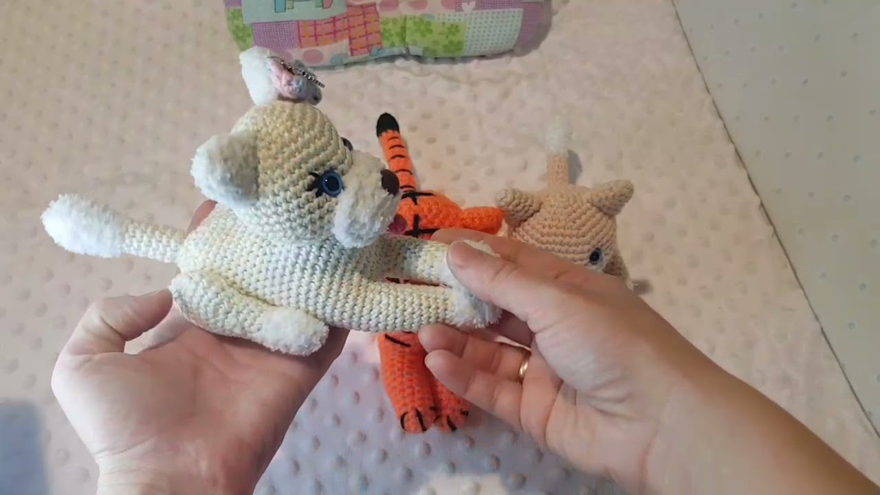Здравствуйте всем, хочу чтоб вы оценили мои новые работы. Связала сначала тигра,потом появилась идея связать котика, ну а потом и собачка связалась.Получились 3 игрушки почти по одной схеме связанные. Ссылка на мое видео