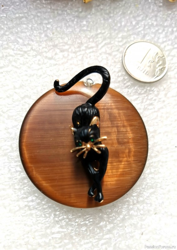 Кулон на основе кабошона кошачьего глаза с литьем из ювелирного сплава в виде фигурки кошки.