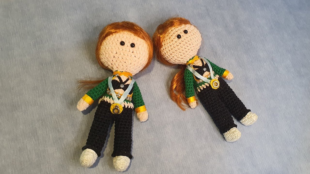 Здравствуйте! Моя новая работа-куколка-спортсменка.Связала я ее для одной девочки,которая занимается гимнастикой. Одна куколка связана полностью из хлопковой пряжи, а у другой- голова,ручки и живот из плюшевой пряжи .Ручки и ножки у неё сгибаются. Рост куколки 24 см. Ссылка на ютуб с Мастер классом