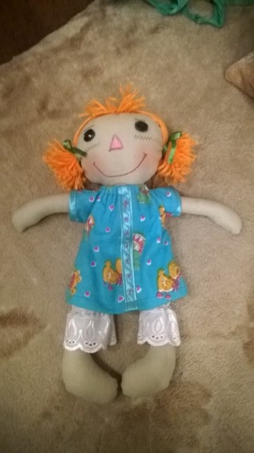 Захотелось сотворить для 2-хлетней внучки куклу. Выкройку взяла из интернета, понравилось, что простая в исполнении, и смешная рожица. Вообще, смотрю, какие работы девочки выкладывают, такие мастерицы! Хочется научиться делать такие же чудесные игрушки. Попытаюсь сшить тильду в красивом сложном наряде, но пока нет времени.