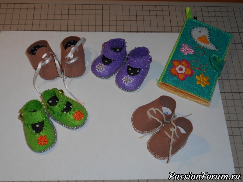 всем здравствуйте! И с наступившей весной, хотя к нам она придет недели через три! Вы знаете, что я люблю делать кукол.Но до поездки в Минск осталось так мало времени, что на куклу его не хватит,вот и решила заняться кукольной обувкой ,размер 5 см-самый нужный размер для моих куклят! Ботиночки из фоамирама ,выполнены на колодочке ,а туфельки из фетра. Справа игольница-книжечка из фетра,с собой в дорогу возьму. Благодарю всех за просмотр!