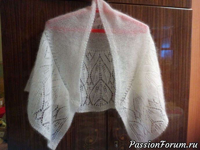 Добрый вечер, мастерицы-рукодельницы! Читаю ваши топики и не перестаю удивляться, сколько увлекающихся разными рукоделиями людей, и какие разные у всех интересы! Душа радуется! А я сегодня к вам с небольшой накидкой. Решила между шалями довязать "долгострой", и причина нашлась, день рождения у лечащего врача. Пряжа лежала в закромах лет пять, а может и больше, пыталась вязать из нее что-то, но не вышло. В позапрошлом году на выставке купила альбомы по вязанию шалей и на обложке увидела как раз то, что надо...