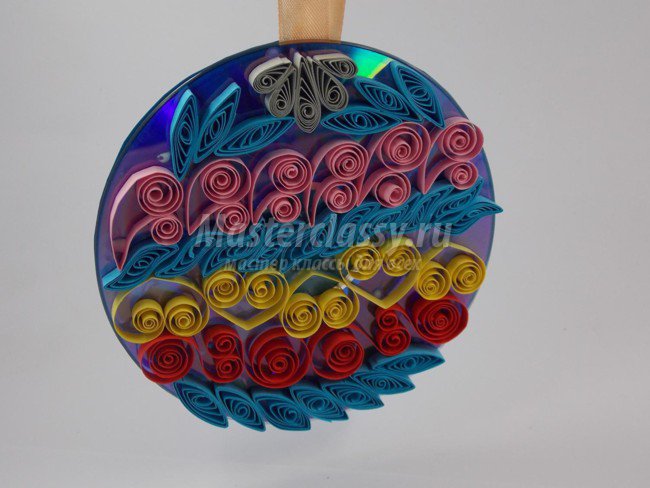 Автор: Агеева Мария, miracle Очень красивый елочный шар можно сделать, используя диск и бумагу. Материалы: - диск; - бумага для квиллинга; - клей ПВА; -шпажка. Ход работы. Шарик будет состоять из разноцветных рядов, которые сделаны из простых элементов квиллинга. Первый ряд состоит из сплюснутых свободных спиралей. Накрутите полоску на шпажку. Дайте ей распуститься. Снимите ее и подклейте кончик. Сделайте несколько таких спиралей. Придайте каждой спиральке форму похожую на глаз, сплюснув края...
