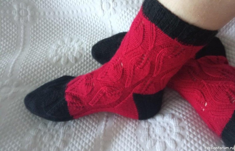 Всем рукодельницам добра и творческого вдохновения! Очередная утилизация пряжи. Увидела здесь на сайте носки "Флога" https://www.passionforum.ru/posts/143068-noski-floga-spicami.html и не смогла не связать, очень понравился рисунок. Только ниточки красные и черные, супервош. Поэтому и всплыл в голове образ цыганки Кармен, как она сгорела в пламени любви. Спицы №2,5 и №2 -резинка.