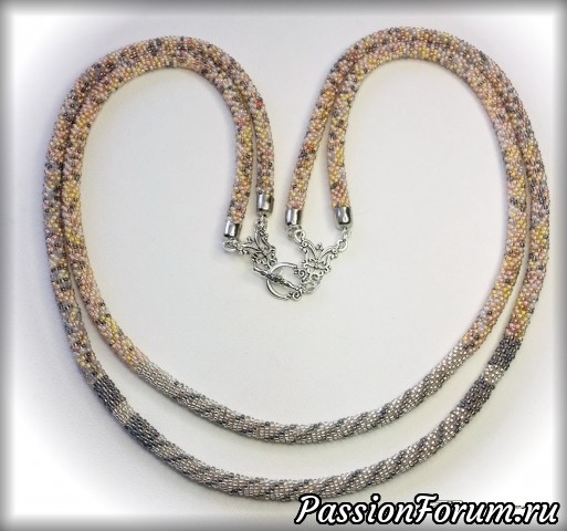 Всем рукодельницам добрый день! Не могу удержаться и не показать свой первый вязанный жгут. Наконец-то после долгих и безрезультатных попыток я одолела вязание жгутов из бисера. И хочу сказать огромное спасибо всем мастерицам этого форума за вдохновение. Это ваши работы и ваши советы и одобрение помогли мне освоить трудную для меня технику. Назвала этот двойной жгут "Меланж". Выполняла его из бисерного микса (чешский бисер) и добавлением серебристого в центральной части.