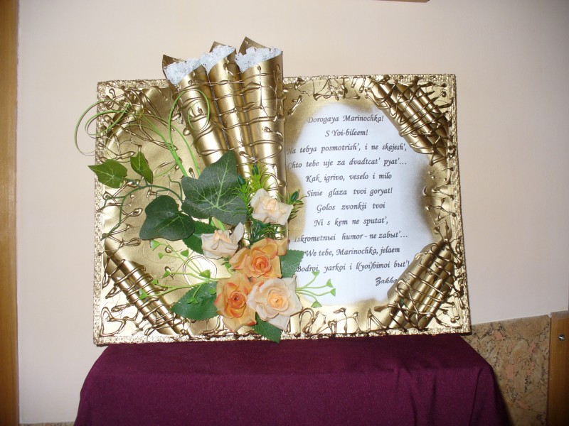 Бродила, бродила по форуму и забрела к Раисе Raissa . Нашла интересную открытку - книгу, топик от 06.04.2015 и ссылочку на МК . А у подружки, как раз, на завтра юбилей! Прикинула, дома все составляющие имеются, стишок сочинила быстренько, и в мастерскую (муж комнатку мне в цокольном этаже организовал, чтоб дома "беспорядок не нарушала"). Самое трудное - найти место для распыления краски, чтоб не устряпать всё и, потом - ждать 2 часа, пока высохнет краска. На улице было +6, но ветренно, пришлось пропры...