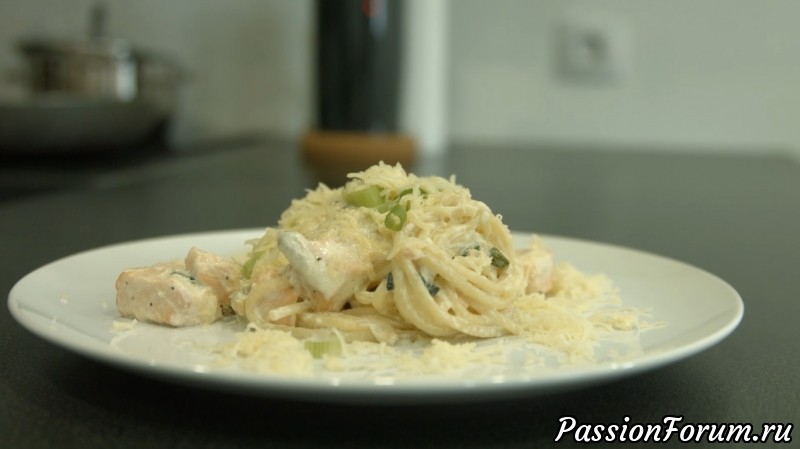 Паста с курицей и грибами в сливочном соусе