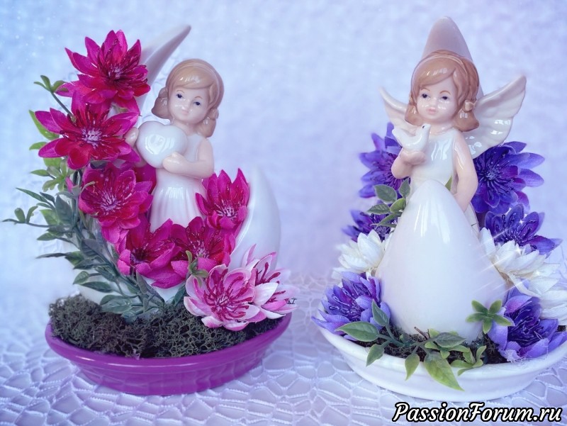 Приветствую Всех. Хочу представить вашему вниманию ещё несколько сувениров, которые можно подарить на 8 марта или на День Влюблённых. Недавно в магазине мне попались кашпо небольшого размера в виде волны. Очень они меня вдохновили. Думала в них сделать небольшой букетик. Когда дошло до дела, смотрю и понимаю, что хочу поставить в них фигурку ангела, ну понеслась фантазия. Нашла свои фигурки, для подставки использовала керамические блюдца от разных кашпо. У меня их очень много скопилось...