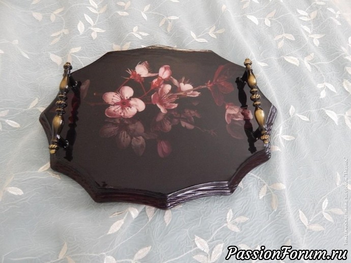 В прошлом году в осенней игре Трое на трое делала подносик. Мне он нравится, это моя удачная работа. Так хорошо вписалась присланная Галей салфетка) Распишу поподробнее, так как это переделка и в игре не удалось показать промежуточные этапы.