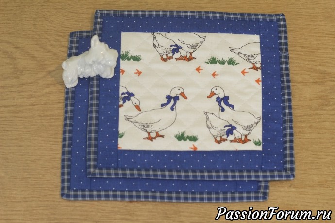 Достаточно большого размера , можно использовать как прихватки, двойной слой хлопкового наполнителя и простежка с двух сторон, так же можно использовать в качестве подставочек под горячее или под кувшин с водой)