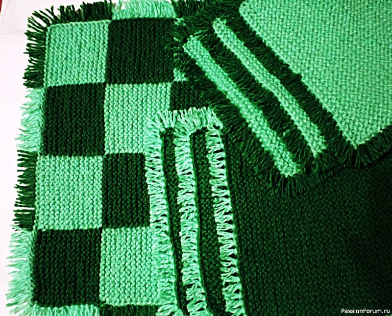 Всем доброго времени суток. Этот комплект вязала в подарок. Комплект подставок под горячее для сервировки состоит из 7 салфеток - 1 большая и 6 маленьких подставок. Салфетки квадратной формы связаны на спицах платочной вязкой, плотные, хорошо держат форму, по краям отделаны бахромой. Использовала пряжу двух цветов темно-зеленого и мятного для контраста. Большая подставочка связана в технике "интарсия". Большая подставка - 29 см * 29 см с бахромой. Маленькие - 18 см * 18 см с бахромой. Спасибо за внимание!