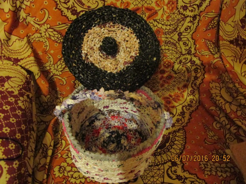 Ведерочко с крышкой. Для пряжи и других предметов рукоделия. Связано крючком из ненужных пакетов, столбиком без накида. Использована гибкая тонкая проволока .