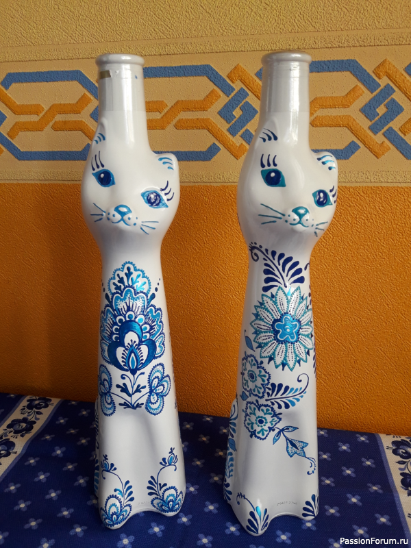 Давно, лет 6 назад подарила мне подруга бутылку вина в форме кошки. Вино мы випили, а выбросить бутылку рука не поднялась, я ее задекупажила, и это была одна из первых моих декупажных работ. Все очень просто - салфетка под гжель и нарисованные глазки. После нее была еще пара белых кошек, но они давно подарены и фото не осталось, а эта бутылка до сих пор живет у меня на кухне. В этом году я прикупила вино в синих бутылках и решила украсить их росписью контурами. Что получилось - смотрите. Все син...