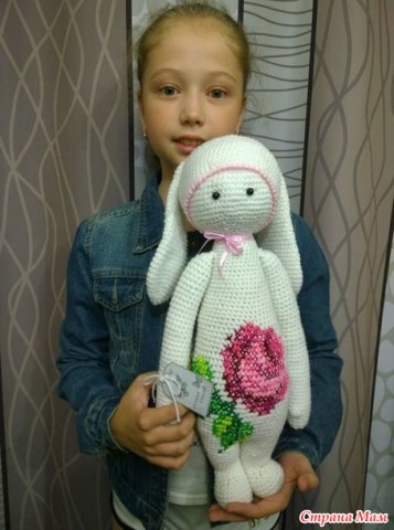 Продам (не дорого) вязанную крючком игрушку зайку "РИТА". Игрушка связана пряжей АЛИЗЕ супер лана,очень мягкая и приятная.Высота зайки 45 см. По вопросам приобритения в личку.